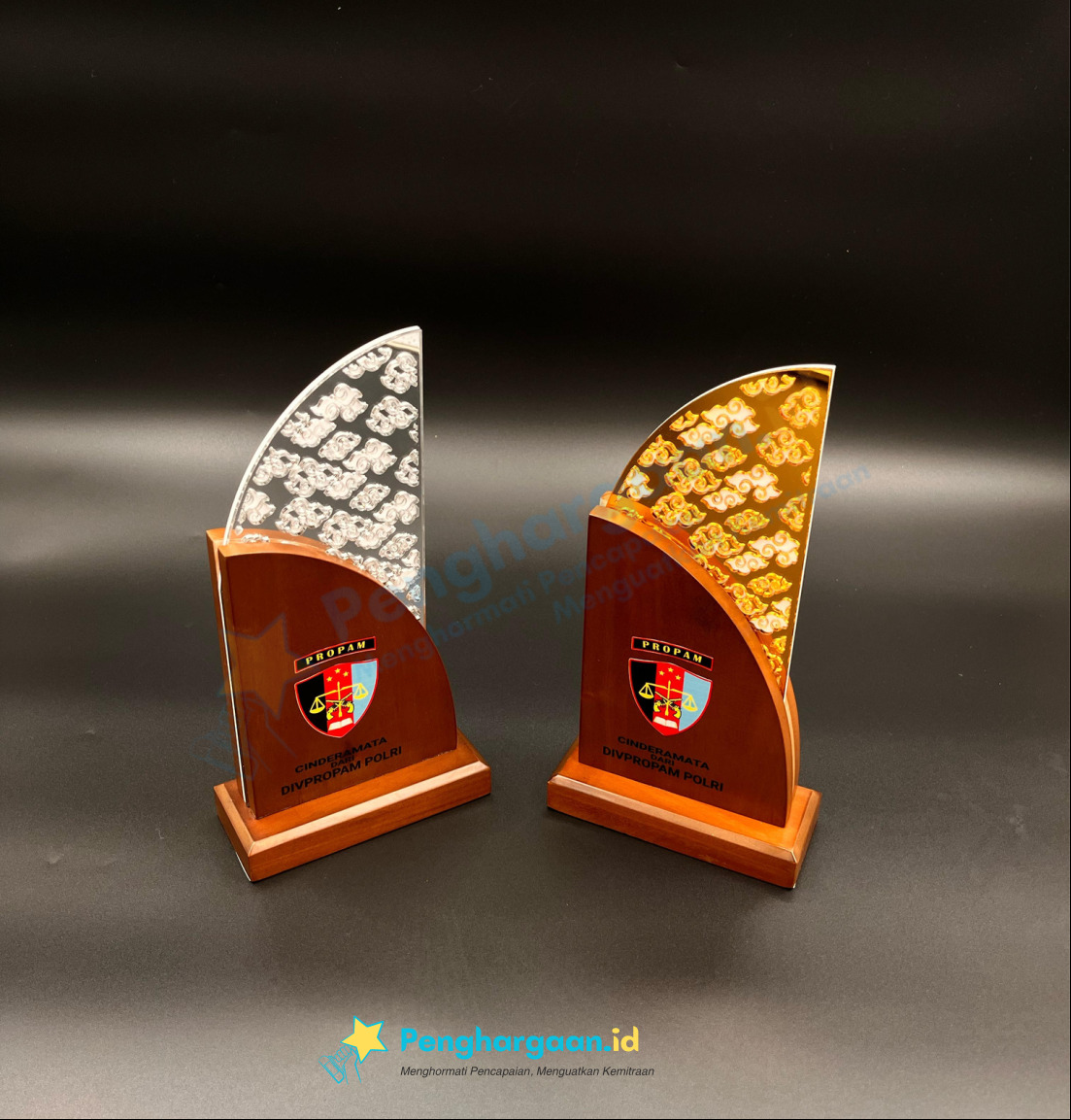 Menggunakan kayu mahoni solid sebagai dasar utama, plakat ini memancarkan kesan hangat, kokoh, dan berkelas. Sisi atas plakat dipercantik dengan akrilik mirror berwarna perak dan emas yang dipotong presisi dan dihiasi dengan motif wayang gunungan, simbol filosofi Jawa yang merepresentasikan awal dan akhir dari sebuah perjalanan hidup—makna yang dalam dan penuh penghargaan.