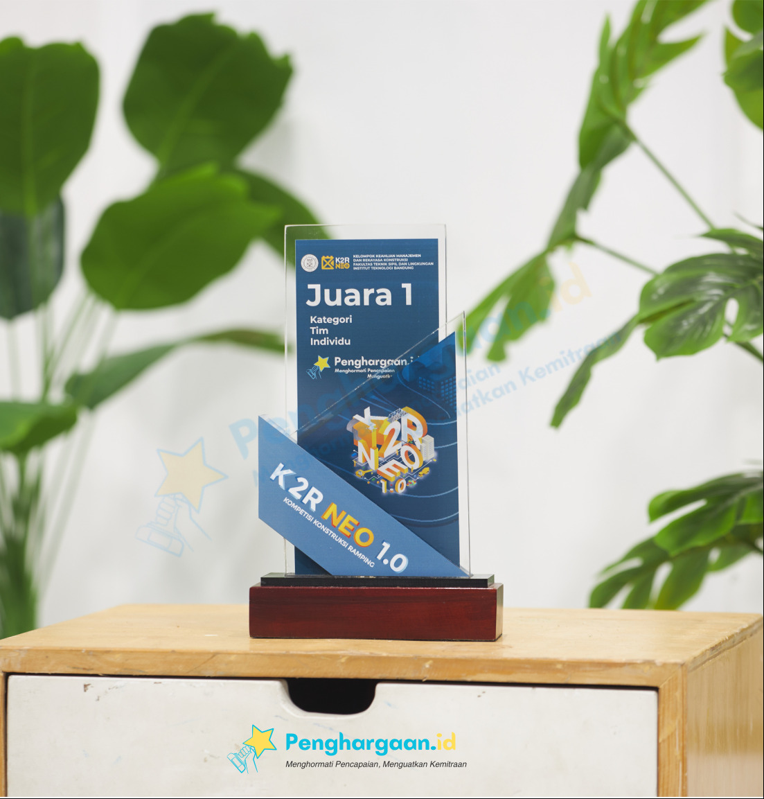 Plakat Kejuaraan "K2R NEO 1.0 ITB" adalah simbol keunggulan dan prestasi dalam dunia konstruksi yang inovatif. Terbuat dari akrilik berkualitas tinggi, plakat ini menampilkan perpaduan antara kejelasan akrilik modern dan kehangatan kayu mahoni yang memberikan sentuhan klasik.